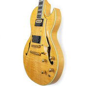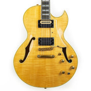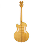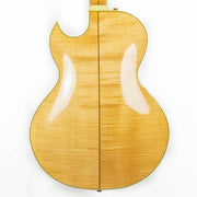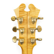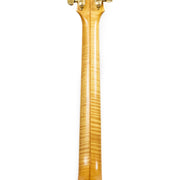 The "Chief Star" is a very unique model, even among Carlo's many one-off builds. This guitar's top, back, sides, and neck are made from stunning, heavily-flamed maple. Even the pickguard is made of gorgeous flamed maple! Complete with multi-ply binding on the neck and body, Carlo added mother of pearl and abalone inlays throughout the fret and a beautiful treble clef in the headstock.