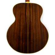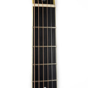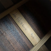The headstock features banjo tuners, somewhat of a rarity for John's work, though not unheard of. The bridge, headstock overlay, truss rod cover, and fretboard are all wonderfully dark pieces of ebony.Â