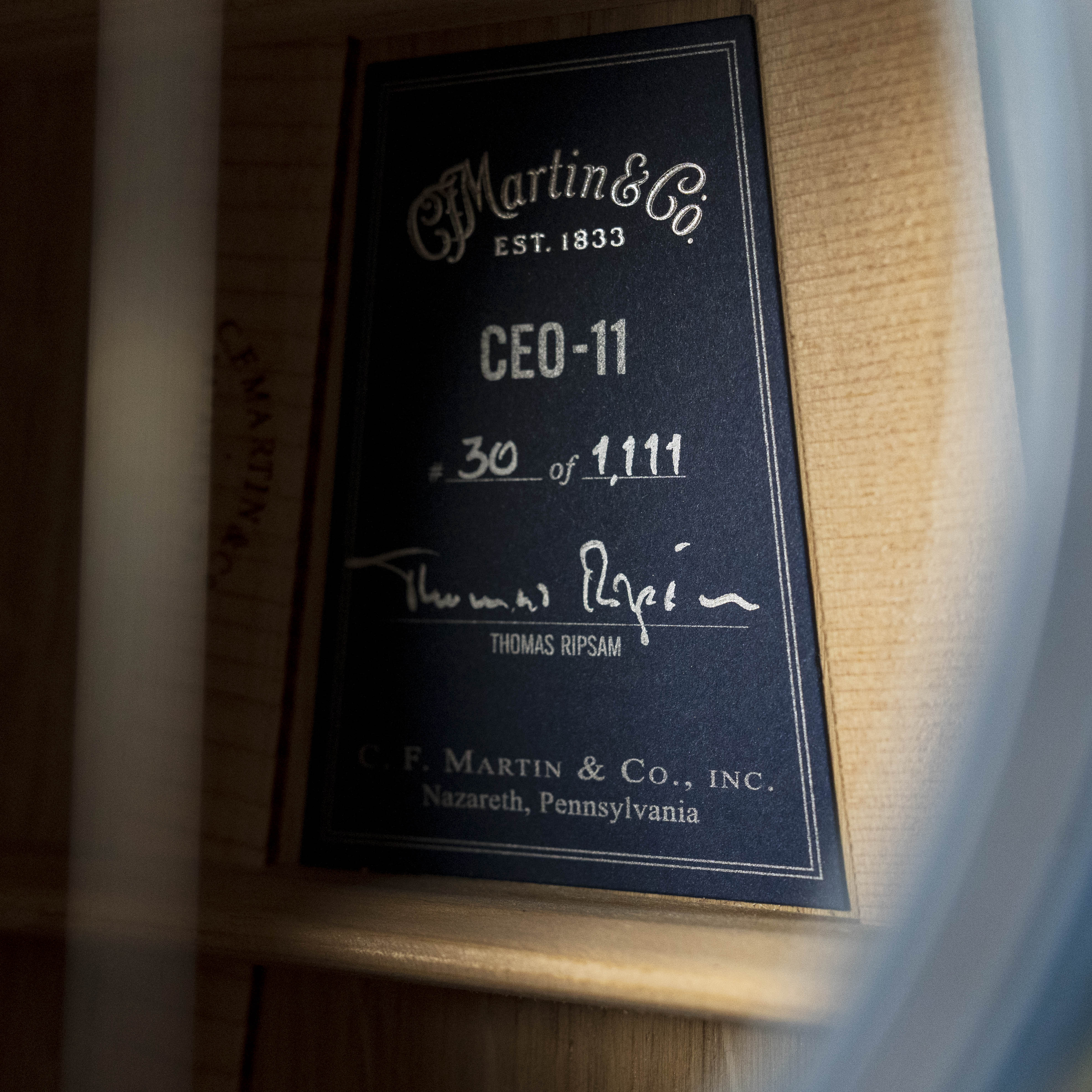 "The Martin CEO-11 is a striking, limited-edition acoustic-electric that blends artistry and craftsmanship in a way only Martin can. Designed by President and CEO Thomas Ripsam, this Grand Auditorium (M) model features a figured white oak multi-piece back and sides paired with an FSC®-certified European spruce top, offering a rich, dynamic sound that’s both powerful and warm. The eye-catching New Horizons blue burst top and dark mahogany-colored sides create a look that’s as bold as the sound it creates. Unique inlays, including a custom Unalome symbol on the headplate, add a personal touch that speaks to finding your creative path. With a two-piece flamed maple neck, European flamed maple binding, and scalloped spruce X bracing, the CEO-11 invites you to connect with your sound and express yourself fully. It’s equipped with Fishman® Aura VT Blend electronics, custom-voiced to Thomas’ preference, ensuring that its tone stands out wherever you play. The number 11, a “master number” that symbolizes intuition and creativity, aligned perfectly with the guitar’s artistic vision, acting as a subtle reminder of the journey every artist takes to find their true voice. Limited to only 1,111 models, the CEO-11 is built for players looking to make a statement – sonically and visually – while staying true to Martin’s legacy of unleashing the artist within. Each guitar includes a blue paper label signed and numbered by Thomas and a molded hardshell case."