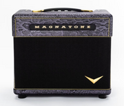 From Magnatone’s Website: "Elevate your rig with the Baby M-80 “Purple Python” edition—where boutique tone meets bold style. Wrapped in hand-selected black and deep-purple snakeskin tolex with deluxe gold piping and hardware, this amp also features a gold-anodized faceplate with Slash’s “Skully” logo. This ultra-portable 12-watt powerhouse delivers the same legendary British crunch and creamy overdrive that Slash calls “the most kick-ass little combo I’ve ever played through.”