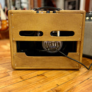 From Tyler Amps: "6 watt combo w/ 1-12", old national type circuit found on many amps from the late 40's to 50's." This amp was custom made for Rudy's Music and features an added tone knobs for added versatility. Sounds killer with a lovely overdrive sound that starts super early.