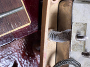 - Small hole drilled in the back. This was done by the owner sometime in the mid-1970s to fix a strap-button so that they could play it right-handed.
