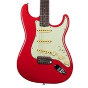 During the late ‘50s and early ‘60s, the popularity of Fender musical instruments flourished, and although the Fender assortment had expanded to include many great new instruments, the Stratocaster® reigned supreme. By 1961, the Stratocaster had taken on a more refined aesthetic, with a 3-Color Sunburst reformulated with a more vibrant red and bolder black edge, topped with a 3-ply pickguard accenting the Strat’s signature curves.