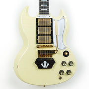 Although the three pickup white SG Custom is undeniably one of the most iconic electric guitars ever produced by Gibson, only a very small number of SG guitars in this particular configuration were made in '62. Originally introduced during a transitional moment SGs still carried the Les Paul name— these instruments were outfitted with a few uncommon features that date them precisely to a fairly narrow date window. The ebony block Maestro™ Vibrola™ system, a visual and tonal rarity seen only on a select few SG Standards and Customs from that specific period, is perhaps the most. This detail alone makes this reissue exceptionally desirable for collectors and players alike.