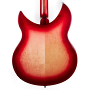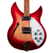 The Rickenbacker 330 has a full, rich and warm sound. Two single coil pickups on a full size body are accented by a traditionally shaped sound hole. The 21 fret Rosewood fingerboard is punctuated by dot inlay fret markers, with full double cutaways permitting access to all the frets. This guitar was produced in 2000 and shows little to no wear. Serial #00_47619, comes with the original case.
