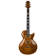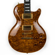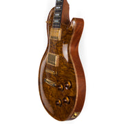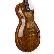 The highly-figured, almost dizzying bookmatched burl maple top is further brought to life by the ultra-thin Hierbas Yellow finish. The mahogany neck and body have been finished in a satin-nitro open pore natural finish, which looks and feels excellent. The neck heel joint has been recessed and sculpted to provide effortless access to the higher frets. The body has also been chambered and is extremely lightweight. The classy bookmatched maple is employed once again on the headstock veneer.