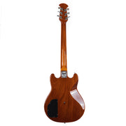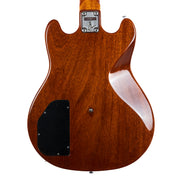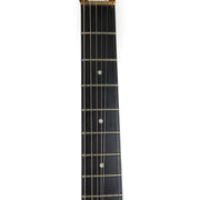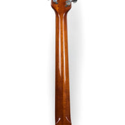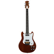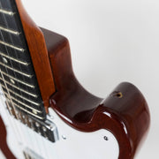 This example has a one-piece Mahogany body, bolted on to a Mahogany neck, complete with an Ebony fingerboard and 24 frets! The double-cut body makes reaching those last few frets a breeze on this guitar, and the 10" radius on the board lends itself nicely to speedy playing styles. A sturdy brass bridge and nut allow this guitar to sustain beautifully. The proprietary mini humbucking pickups sound great to us here at the shop. They are very similar to other mini humbuckers from this period, but just a little bit hotter in our opinion. They can push most amps into a natural overdrive with relative ease.