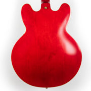 From Gibson Guitar’s Website: "In partnership with Gibson™ Custom, Epiphone is proud to release the 1959 ES-355, a stunning recreation of the preeminent ES™ model from the legendary class of 1959. It’s the top-of-the-line ES model in all its glory, from the dimensions to the contours to the precise inlay patterns and sonic experience. The 1959 ES-355 features a 5-ply layered maple/poplar body with a solid maple centerblock for sustain and feedback resistance, a one-piece mahogany neck with a 50s Rounded Medium C profile, and an ebony fretboard that is adorned with block mother of pearl inlays. The Gibson-style “open book” headstock features the Split Diamond and Epiphone logo inlays in mother-of-pearl, along with gold Grover® Rotomatic® tuners and the Inspired by Gibson double diamond logo etched on the back. The 1959 ES-355 is powered by a pair of Gibson Custombuckers that are hand-wired to CTS® potentiometers, Mallory™ capacitors, and a Switchcraft® pickup selector switch and output jack. A brown and pink hardshell case with the Inspired by Gibson Custom logo is also included."
