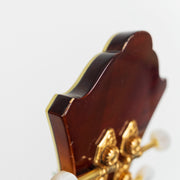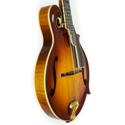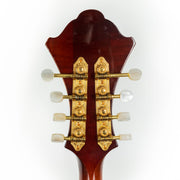 "Monteleone's Grand Artist mandolin was the culmination of many years of the luthier's recreations of the Lloyd Loar F-5 mandolins. After producing nearly 30 of those instruments, Monteleone made modifications and designed his own instrument, one that offered its own signature look and improved its playability for the musician: the abbreviated ebony pickguard no longer obscured the treble sound hole, the arched fretboard was a more natural fit to the fingers, the elongated hollow scroll offered a more resonant quality and both the cast tailpiece and the ebony tailpiece permitted improved bridge performance."