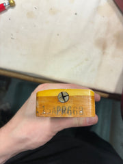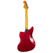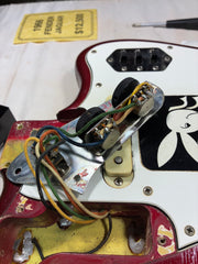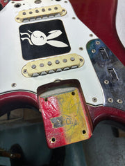 A Jaguar is already pretty cool, but then with a custom color like this Candy Apple Red with matching headstock, it makes it uber-cool. The worn finish by the armrest is totally cool, with the gold and white undercoats showing from years of hard earned playing. Check out the original owner with this Jag in the late 60's, seems like it had that sticker on it for pretty much its whole life! Parts of the finish seems to have a slight texture to them, as shown in photos, this seems very likely to be from an early Fender/Parker 'body guard', as seen in the photo of the original owner. We have left the finish as is, the new owner may want to remove the marking left by the body guard. This example is in all original condition, with the only replacement being new foam for the string mute. Serial #142557, comes with the original case.