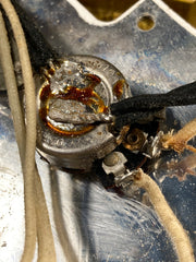 This example is mostly original with a refret, replaced nut and a resoldered ground wire. The legible pot codes are dated the 10th week of 1966. The neck has a neck date of May 1966 with two '66 pickups and one '64 bridge pickup date. Serial #160759, comes with the original case and trem arm.