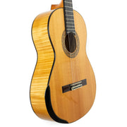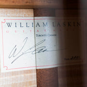 Canadian builder William "Grit" Laskin is the illustrious creator of this custom beauty. Known for his incredible inlay work, Laskin appointed this classical guitar from 2001 with an absolutely stunning headstock inlay based off an original sketch of a sculptor and their creation as well as a cupid spanning the first 3 frets based on a drawing by Boticelli. The guitar itself is also beautifully appointed, using premium grade Cedar for the top, highly flamed maple back and sides, ornate stitch pattern rosette, multi-ply wood binding, smooth acting banjo style tuners, and the signature Laskin armrest this instrument is in a class all on its own. The action is nice and low and the sound is heavenly with a rich bass on the lower strings and sweet highs with remarkable sustain.