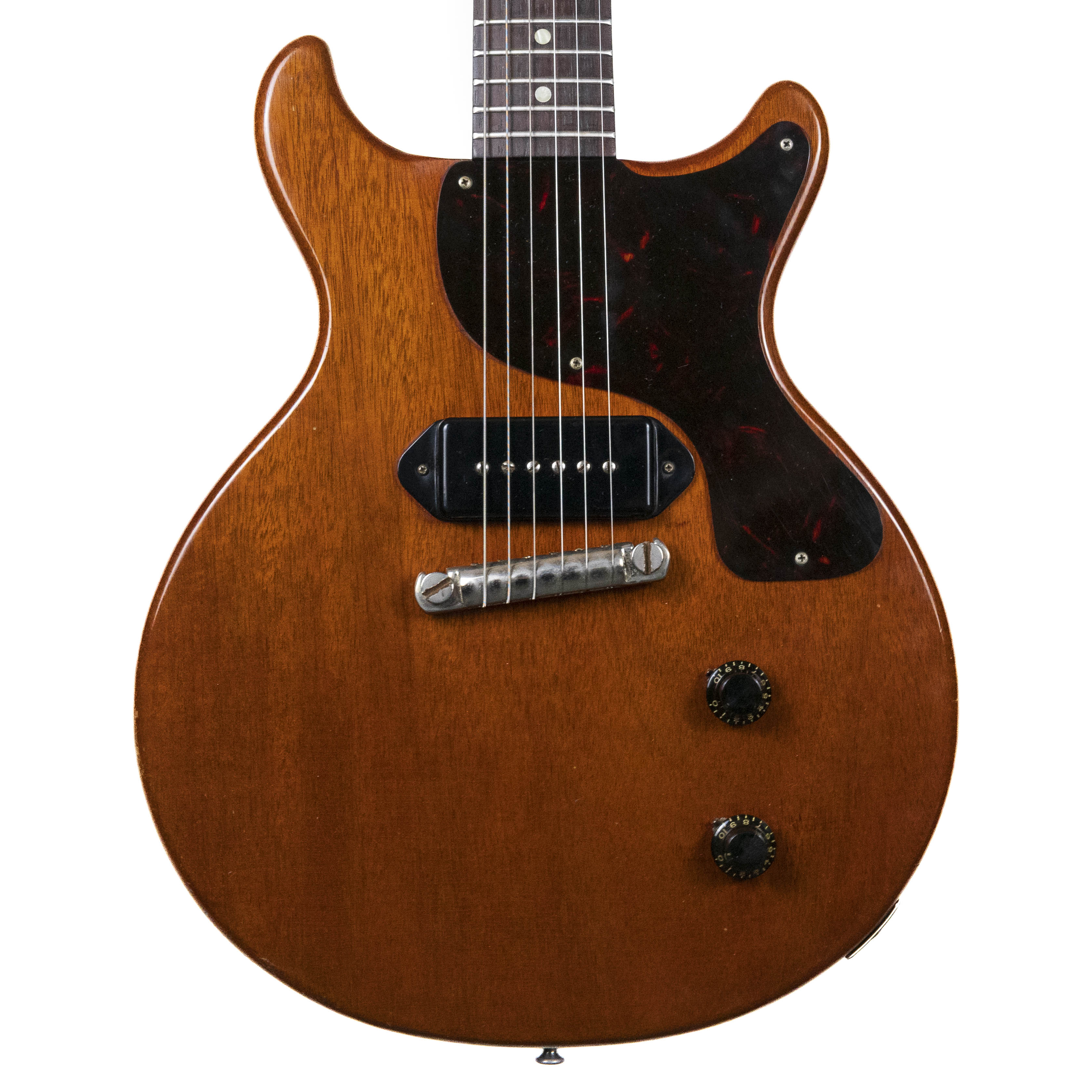 A pure rock n roll machine, this '60 LP Jr. is all you need: a slab mahogany body with a single P-90. This one has aged perfectly with a great patina, light playwear but not major breaks or repairs. The neck heel is in perfect shape and this guitar is all set to go with a fresh set-up by our in-house techs. This example is in largely original condition with a replaced bridge but original electronics and hardware. Serial #01920, comes the original chipboard case.
