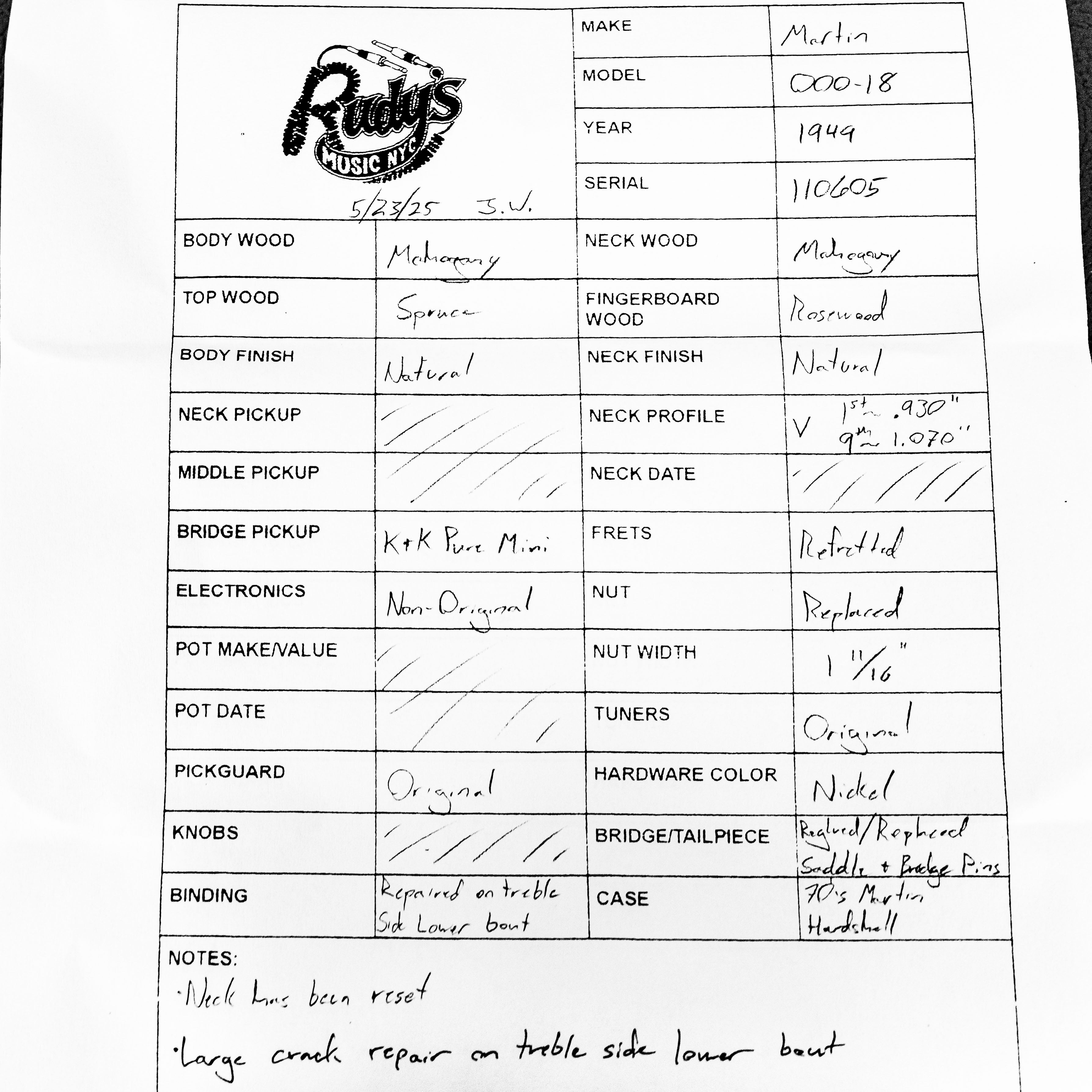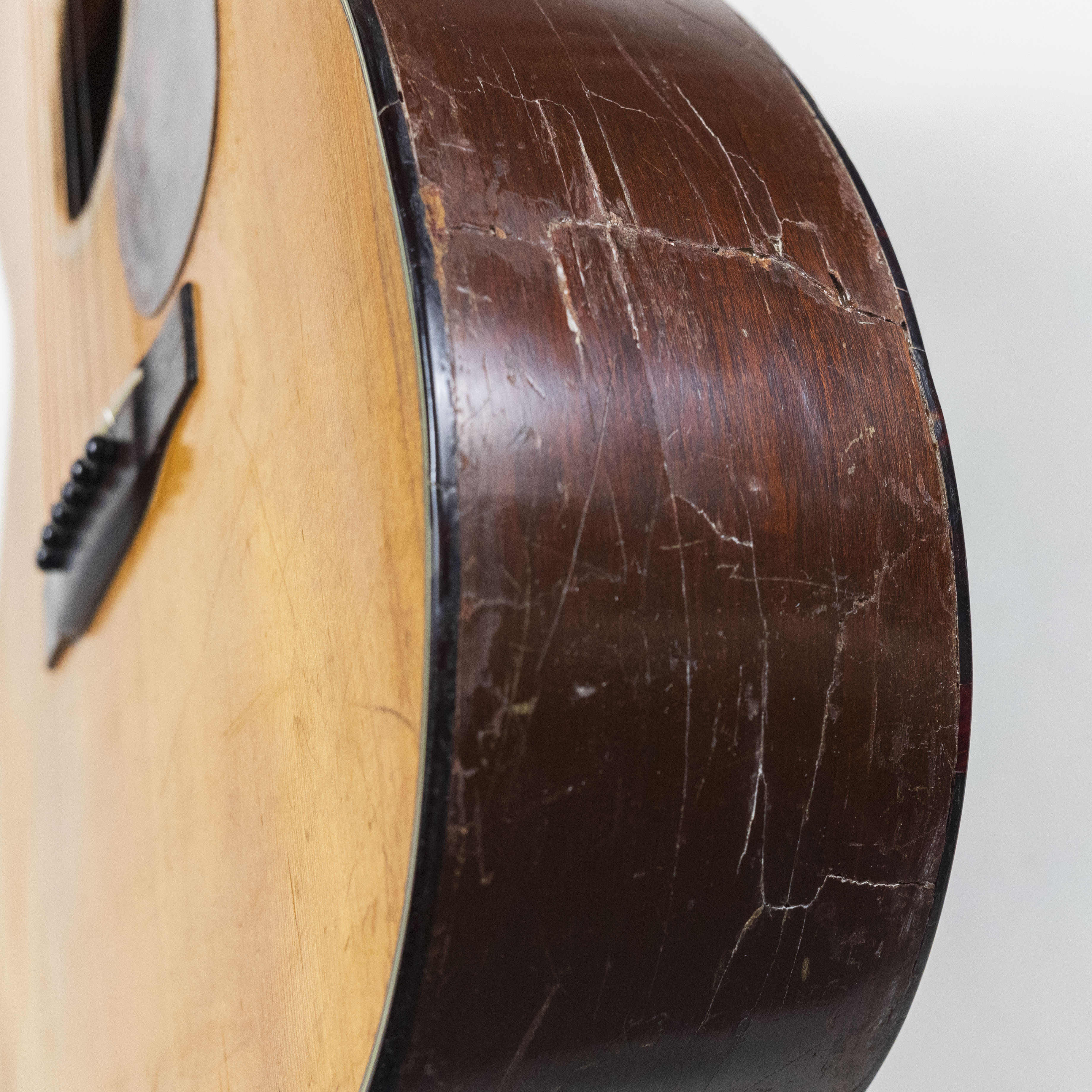 This example has had the bridge reglued, with a replaced saddle and new bridge pins. It has a new nut, has had a refret, neck reset and a large crack repair on the treble side lower bout. A K&K pickup was added at some point in its history. Serial #110605, comes with a non original '70s Martin case. Please refer to the provided photos for more detail on the condition. As with all of our vintage listings, a vintage spec sheet is included which details the repairs and any changes of note.