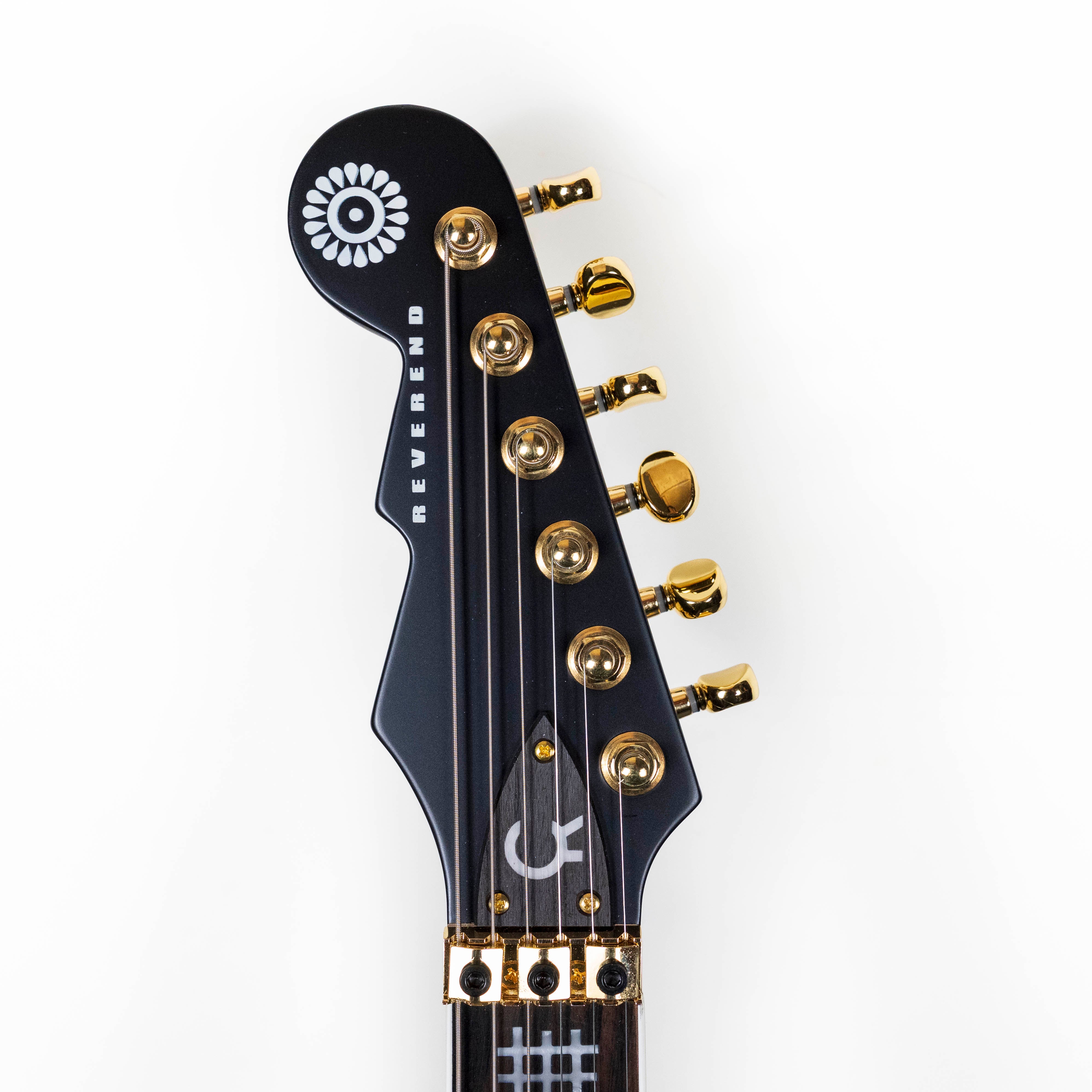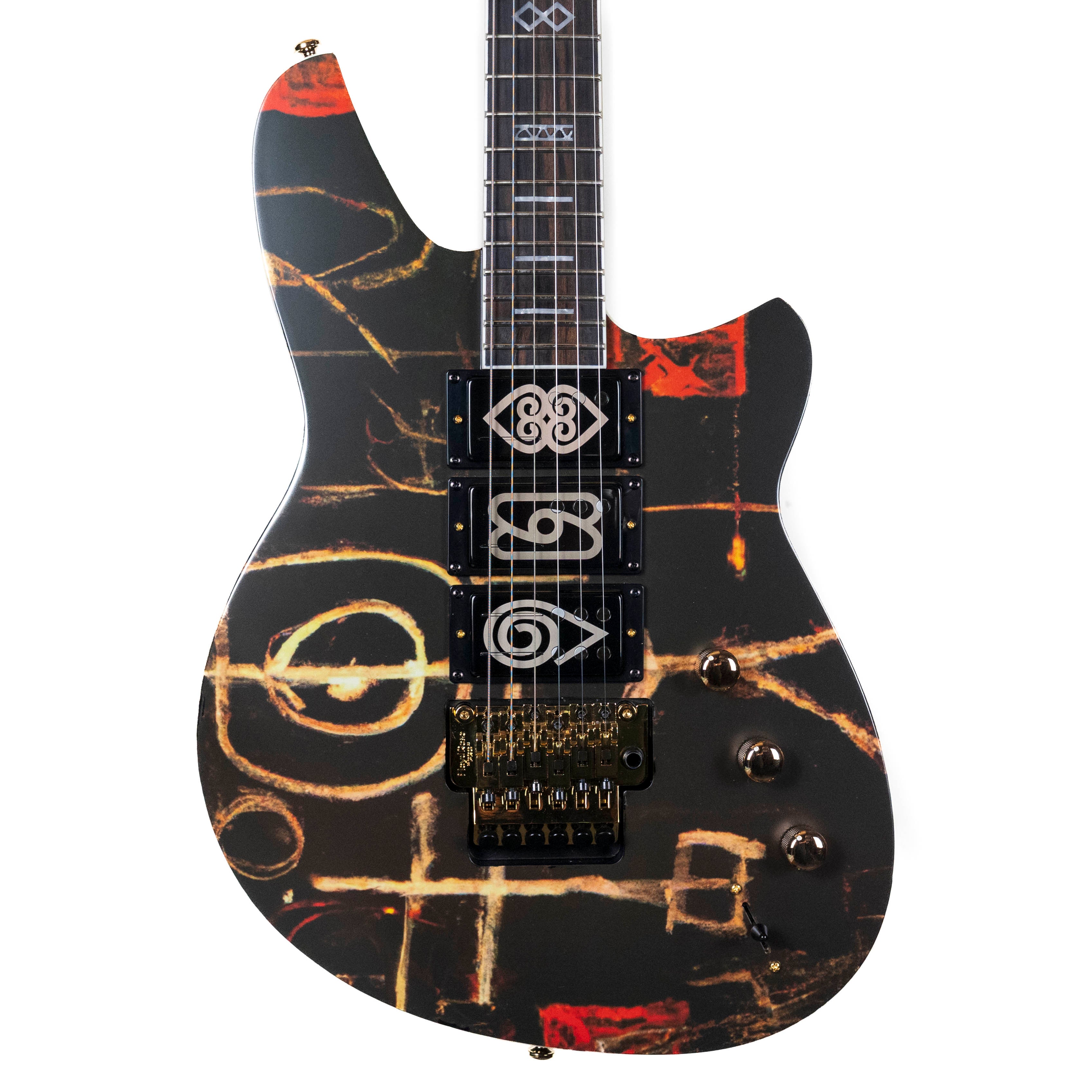 "From the vivid imagination of Vernon Reid comes the Totem Series of Reverend Vernon Reid guitars. A sleek body features graphics inspired by Carl Jung’s Collective Unconscious Theory, Joseph Campbell’s The Hero’s Journey, and artists Jean-Michel Basquiat and Romare Beardon. West African Adinkra symbols adorn the pickups and headstock, while American Hobo symbols grace the fretboard. Africana and Americana symbolism meld with profound graphics, conjuring vivid images that speak to humankind’s perilous, yet necessary journeys. While visually stunning, these instruments are also refined tools of the trade. The recipe of Korina, ebony, and Railhammer Pickups, coupled with the sheer metallic mass of the Floyd Rose, serves up a tone best described as punchy! Harmonics pop, single notes sing, and chords ring with tasty overtones – delivering that knockout punch whether you’re playing clean funk or heavy rock. Now’s your chance to own a genuinely collectible art piece that sounds and plays as amazing as it looks!"